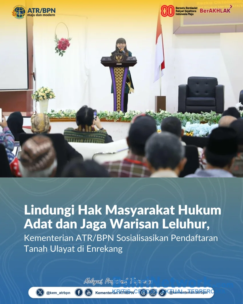 BahriNetwork.com | Enrekang – Kementerian Agraria dan Tata Ruang/Badan Pertanahan Nasional (ATR/BPN) kembali mengumbar komitmen: tanah ulayat tidak akan pernah dijadikan milik negara. Pesan itu ditegaskan Staf Khusus Reforma Agraria Rezka Oktoberia saat sosialisasi pendaftaran tanah ulayat di Enrekang, Sulawesi Selatan, Kamis (28/8/2025).