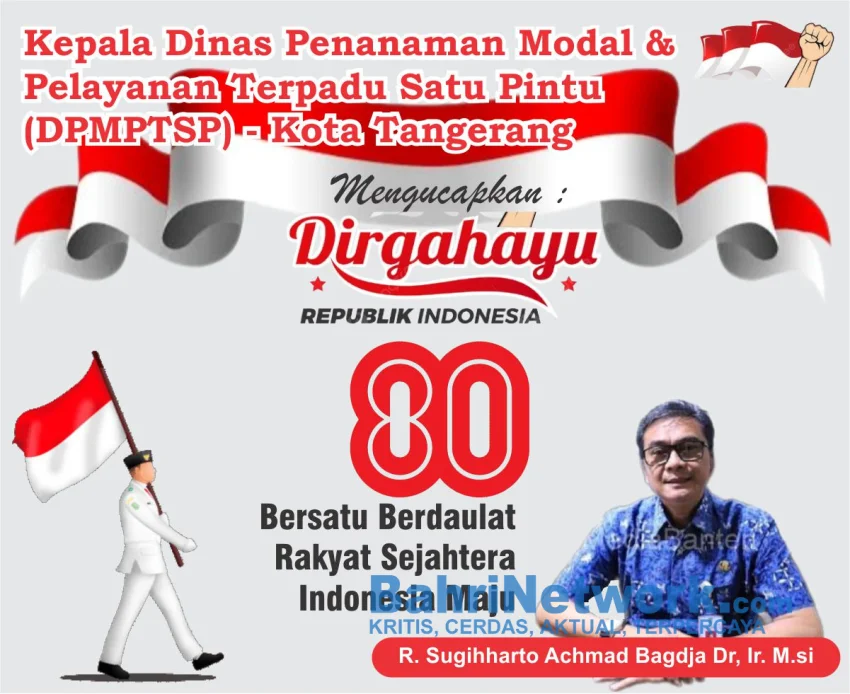 Dalam momentum Hari Ulang Tahun ke-80 Republik Indonesia, Kepala Dinas Penanaman Modal dan Pelayanan Terpadu Satu Pintu (DPMPTSP) Kota Tangerang, R. Sugiharto Achmad Bagja, Dr. Ir. M.Si, bersama jajaran staf menyampaikan ucapan selamat Dirgahayu kepada seluruh rakyat Indonesia.