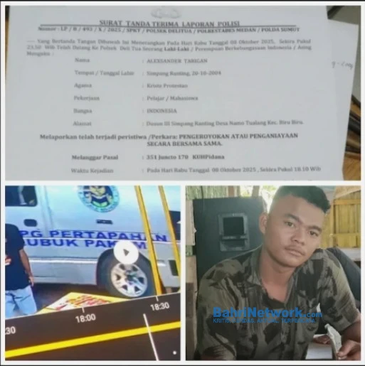 BahriNetwork.com | Medan — Aksi penganiayaan dan pengeroyokan terhadap seorang pengemudi angkot bernama Alexander Tarigan oleh sopir Mobil Satuan Pelayanan Pemenuhan Gizi (SPPG) Pertapahan Lubuk Pakam menjadi sorotan serius publik. Peristiwa ini terjadi pada Rabu (8/10/2025) pukul 18.00 WIB di Gang Pahlawan, Kelurahan Kedai Durian, Kecamatan Delitua.
